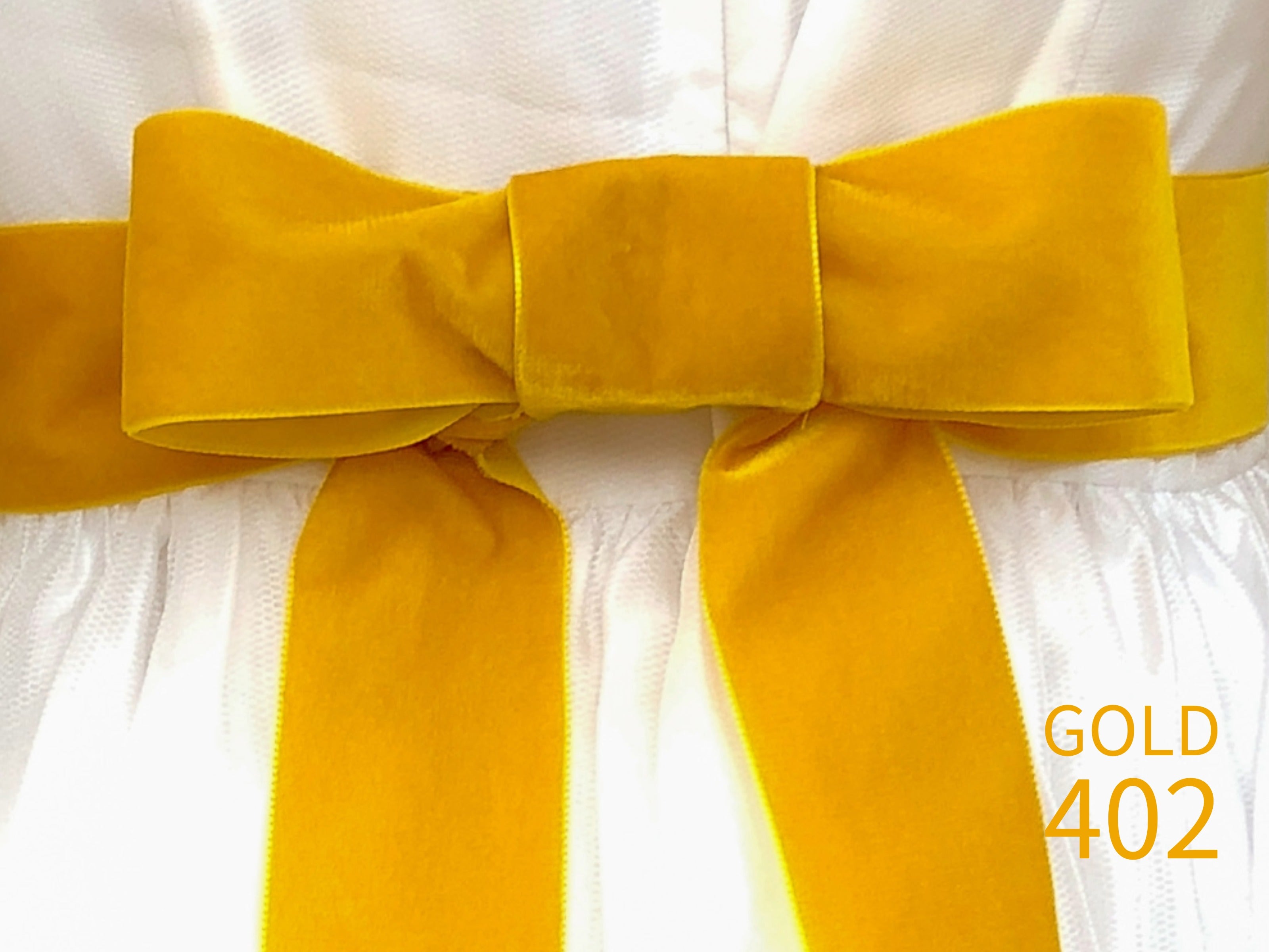 Samtgürtel mit genähter Schleife in gelben Nuancen wie Zitrone, Banane, Mais, Sonnengelb, Goldgelb, Gold, Senf, Kamel, Sonnenblumengelb, Pastell Gelb und in vielen anderen Farben erhältlich.