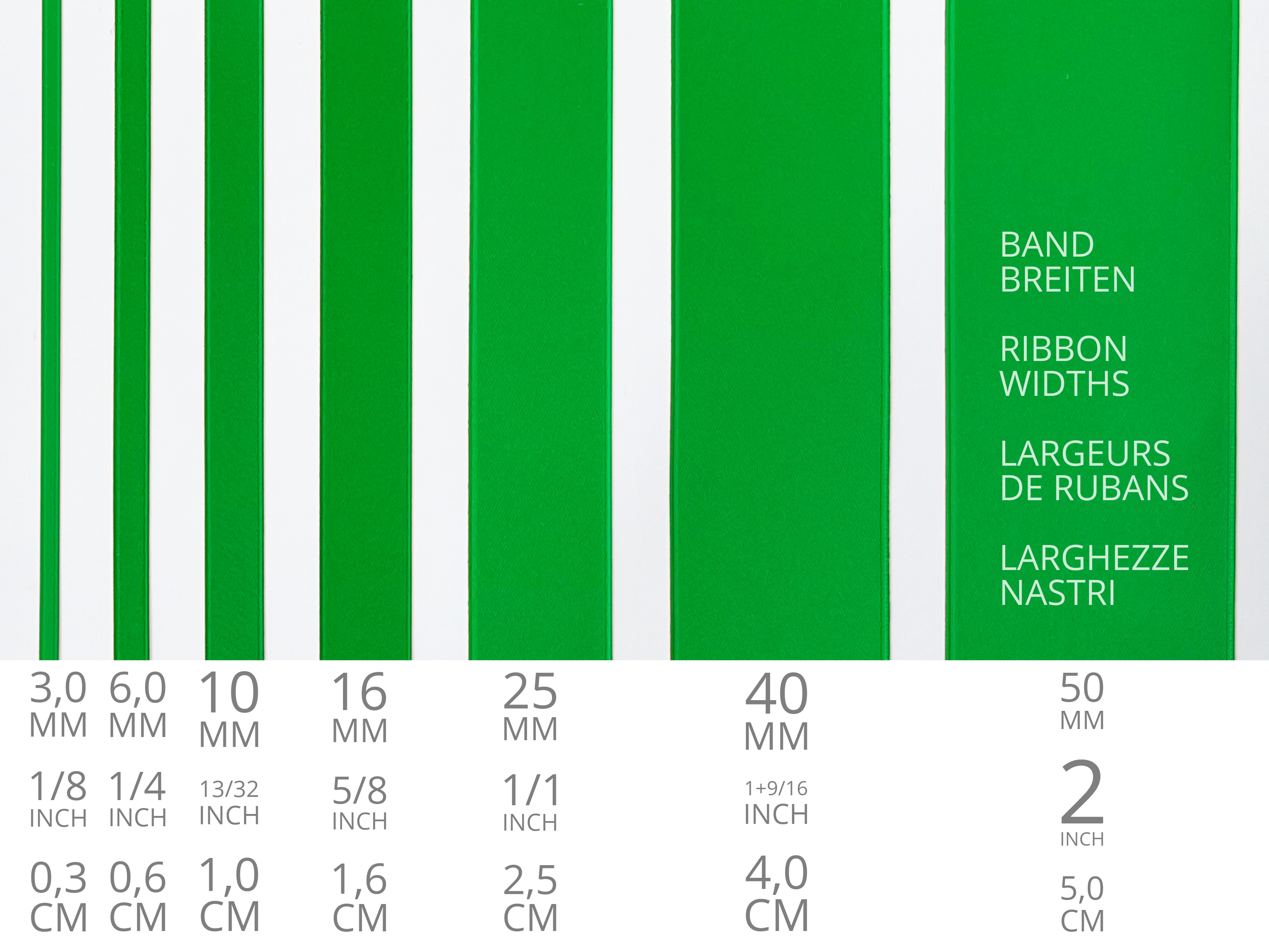 Doubleface Satinband in Schweizer Qualität. 13 helle Grüntöne mit zart schimmernder Farbtiefe in 7 Breiten. Schadstofffrei