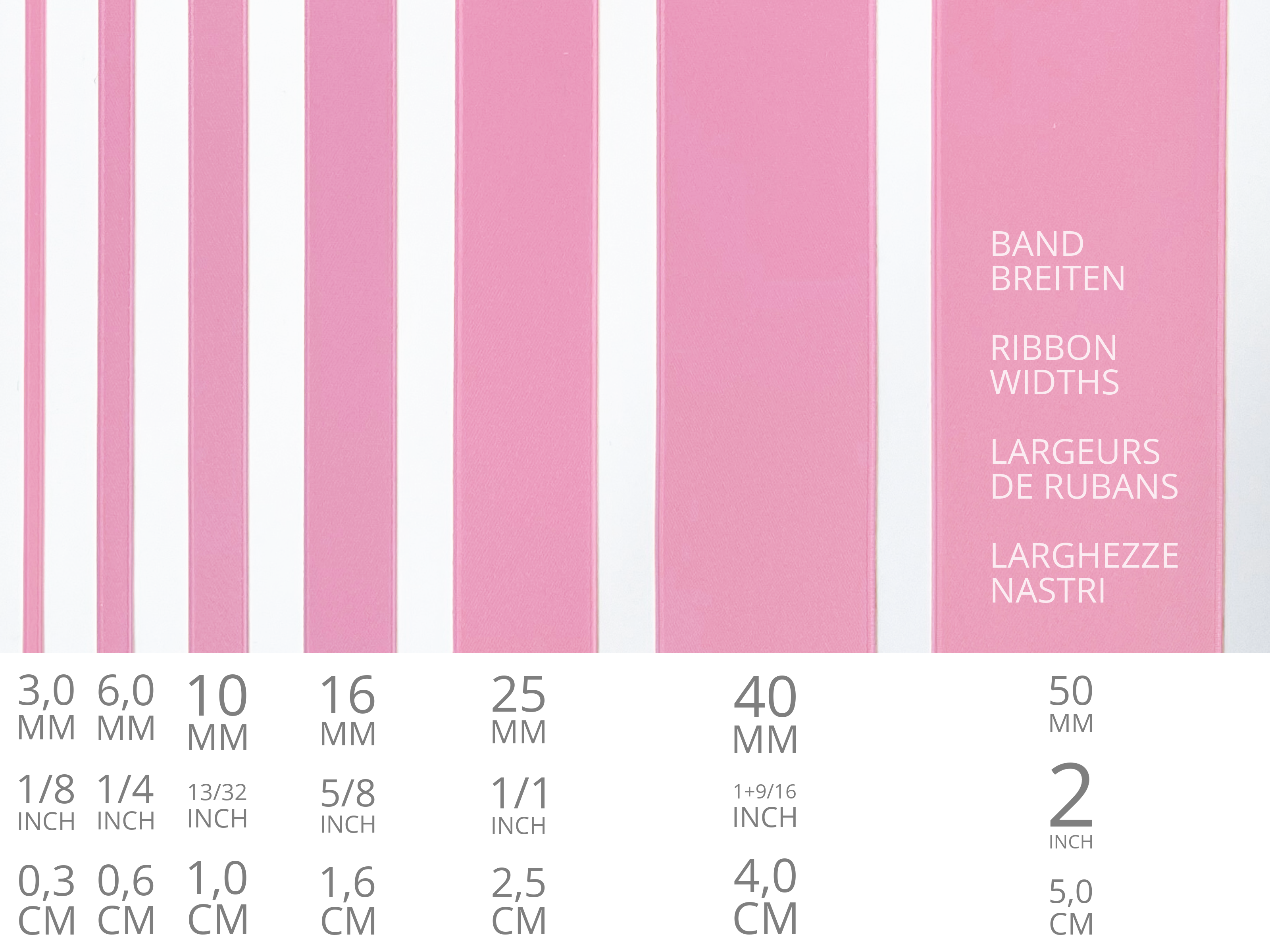 Hochwertiges Satinband in den Nuancen wie Altrosa, Shocking Pink Blush, Fuchsia und in 100 weiteren Farbtönen und 3 Breiten erhältlich: alle Satinbänder.