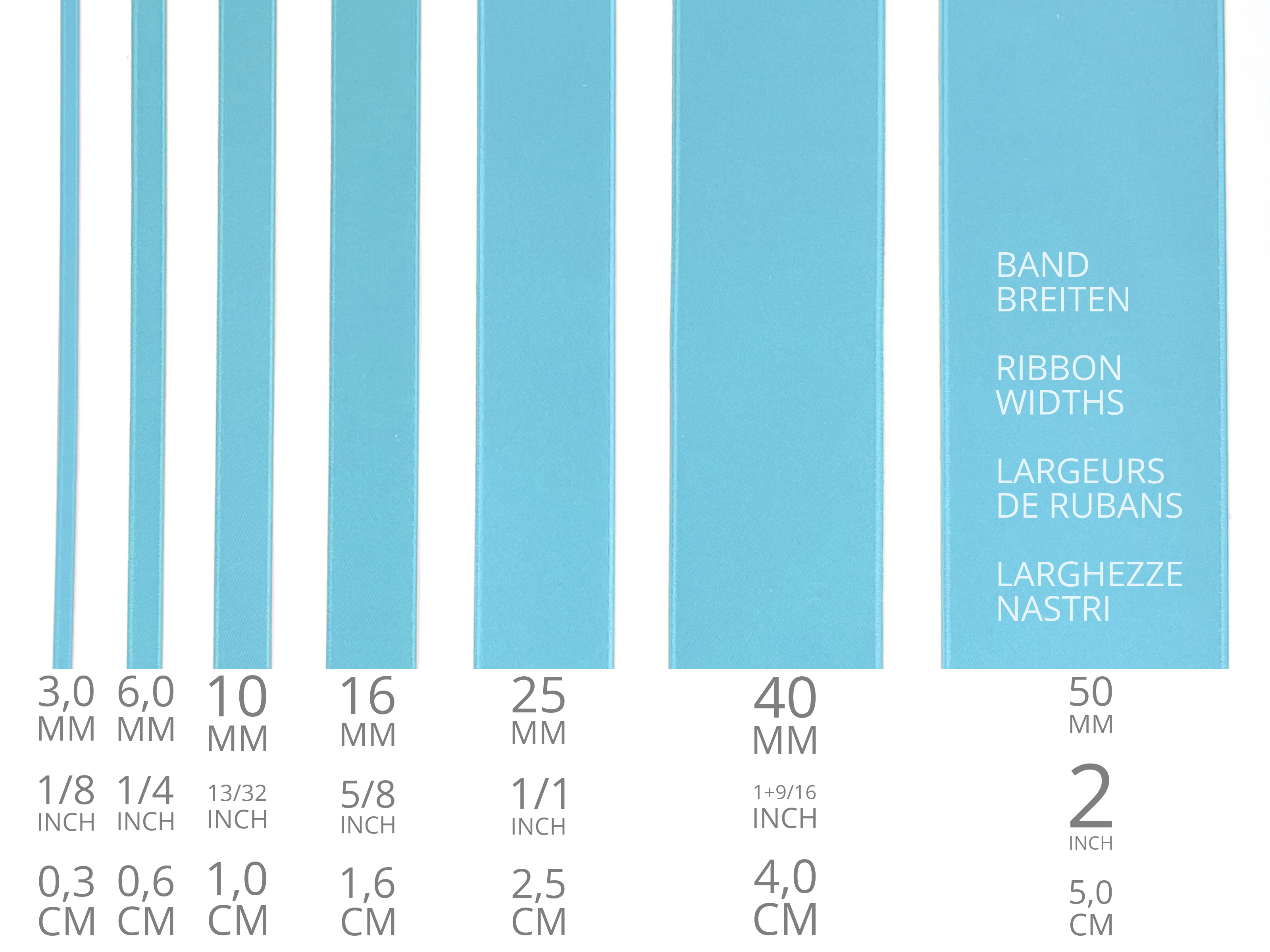 Doubleface Satinband in Schweizer Qualität. 7 helle Blautöne mit zart schimmernder Farbtiefe in 7 Breiten. Schadstofffrei