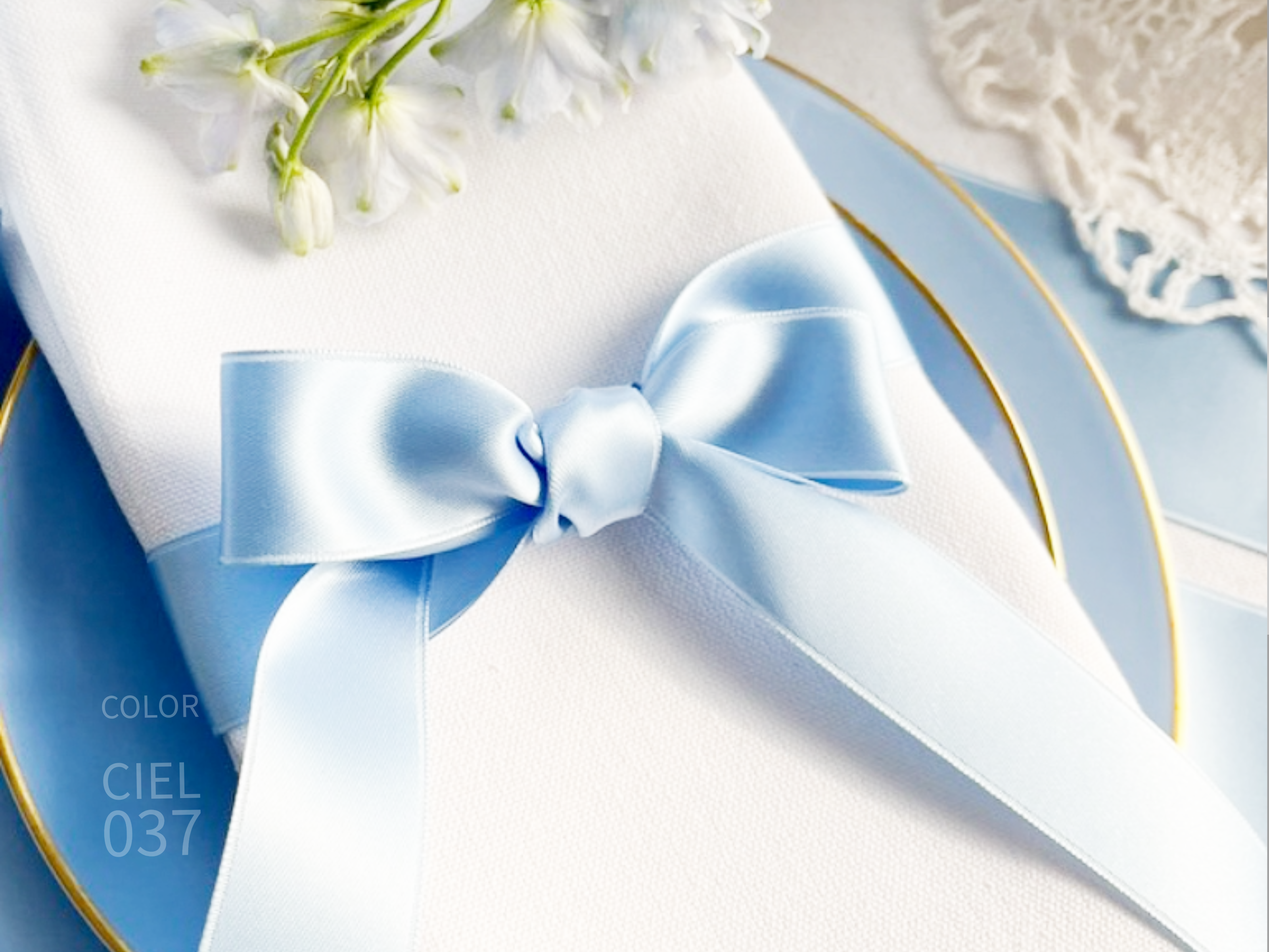 Hellblaues Satinband in Farb-Nuancen wie Babyblau, Graublau, Taubenblau, Himmelblau, Navy, Nachtblau, Königsblau und in vielen weiteren Farbtönen und Breiten erhältlich: alle Satinbänder.