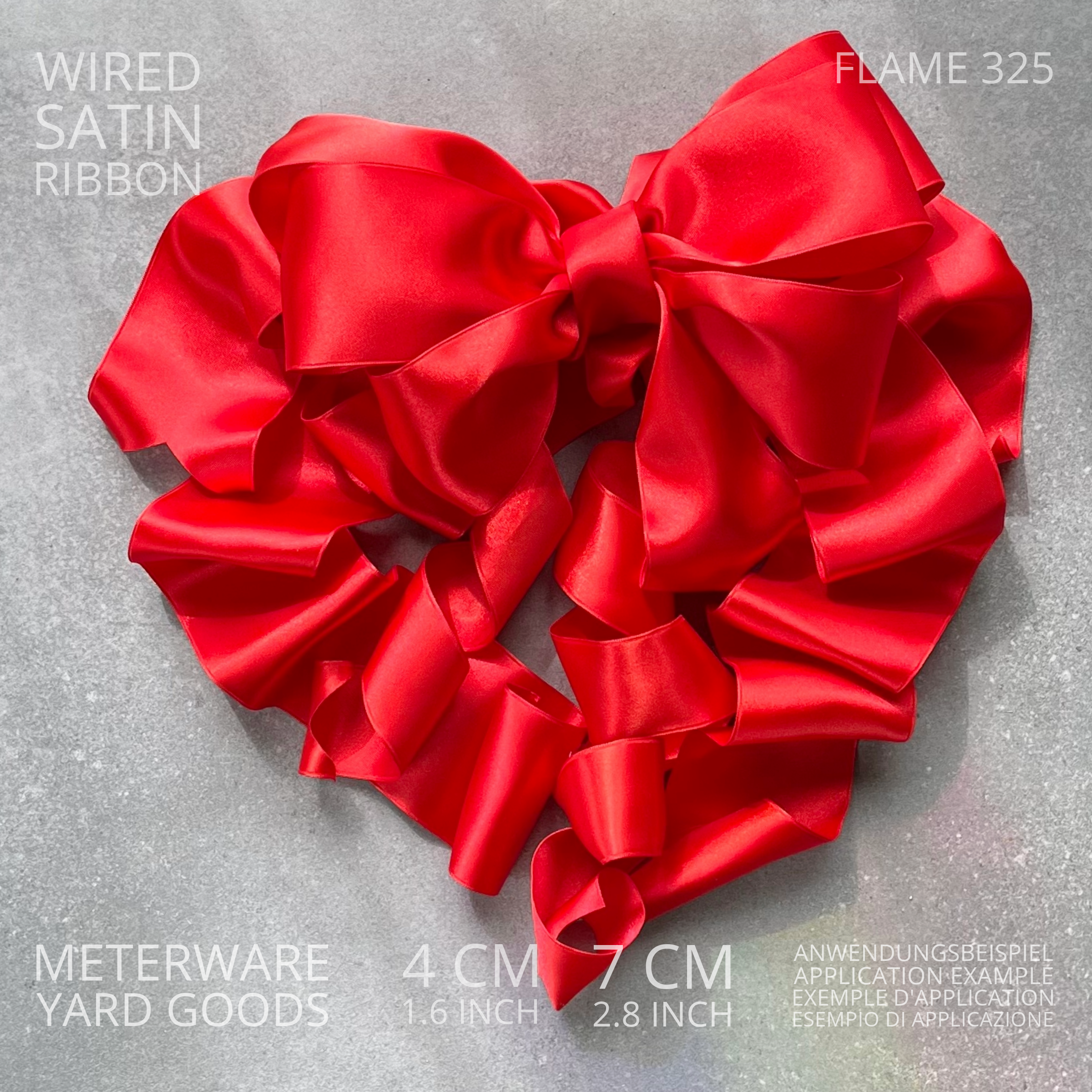 Rotes, hochwertiges Satinband mit unsichtbar verdrahteten Webkanten erhältlich in 30 Farben, jeweils in 4 cm und 7 cm Breite. So gelingen voluminöse, formstabile Schleifen und gewellte Bänder. Satinbänder mit einem zarten Draht in der Webkante sind einfach zu formen und zu positionieren. Durch die ‘Double Face’ Ausstattung als Qualitätsmerkmal sehen vordere und hintere Seiten gleich aus, was jedem Kreativ-Projekt eine professionelle Aufwertung schenkt. Seegang Berlin lagert Satinbänder als Dauersortiment mit einer extrem weit gefächerten Farbpalette und vielen Bandbreiten für Ihre persönlich favorisierten Farbkombinationen aus perfekt passenden Farbtönen. Das besondere unserer Bänder ist die hohe Garndichte. Diese Qualität ist sichtbar und bei jedem Gebrauch fühlbar. Sie können sicher sein, dass die Bänder auch bei Nässe nicht abfärben und ihren eleganten Glanz und Ihre Farbtiefe bei intensiver Nutzung und dauerhafter Sonneneinstrahlung bewahren. Schleifenbänder dieser Qualität sind besonders vielseitig anwendbar und immer wieder verwendbar.