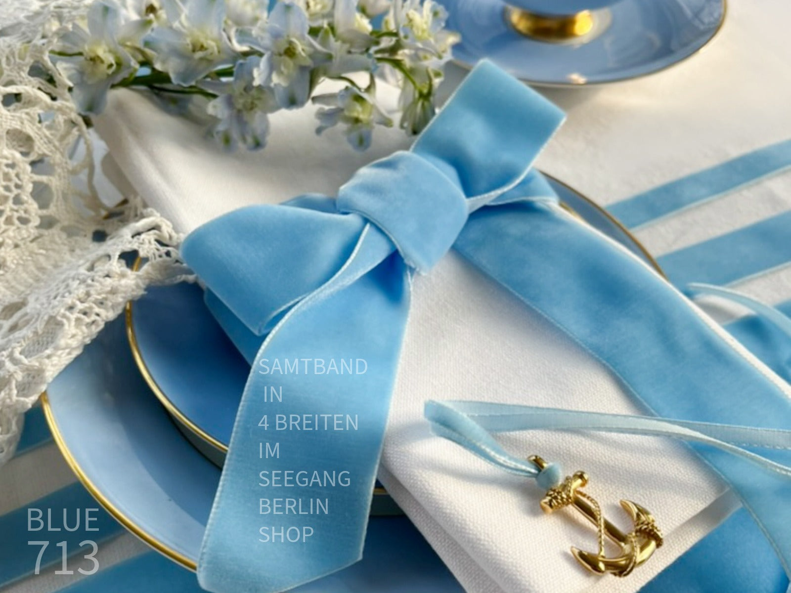 Hellblauer Samtgürtel mit perfekter Schleife in den Nuancen wie Himmelblau, Babyblau, Veilchenblau, Pastelblau, Dusty Blue, Williamsburg Blue und vielen anderen zarten oder intensiven Farbtönen und Breiten erhältlich.